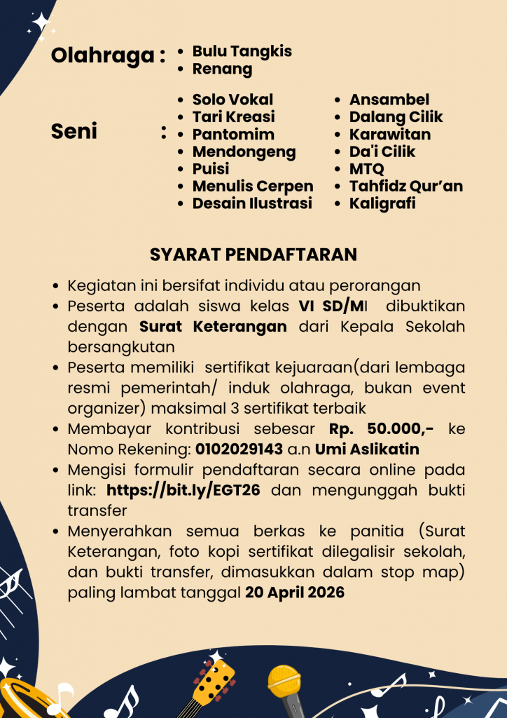 Melalui kegiatan ini, peserta dapat berkompetisi dalam berbagai bidang, mulai dari olahraga, seni, kreativitas, literasi, hingga keagamaan. Kegiatan ini menjadi wadah bagi siswa untuk tampil percaya diri, kreatif, sportif, dan berprestasi.