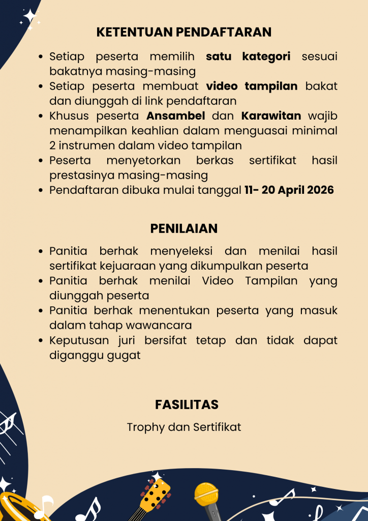 Seleksi dilaksanakan melalui berkas, video penampilan, dan wawancara. Peserta terbaik akan diumumkan dan diundang langsung ke SMP Negeri 2 Ngawi.