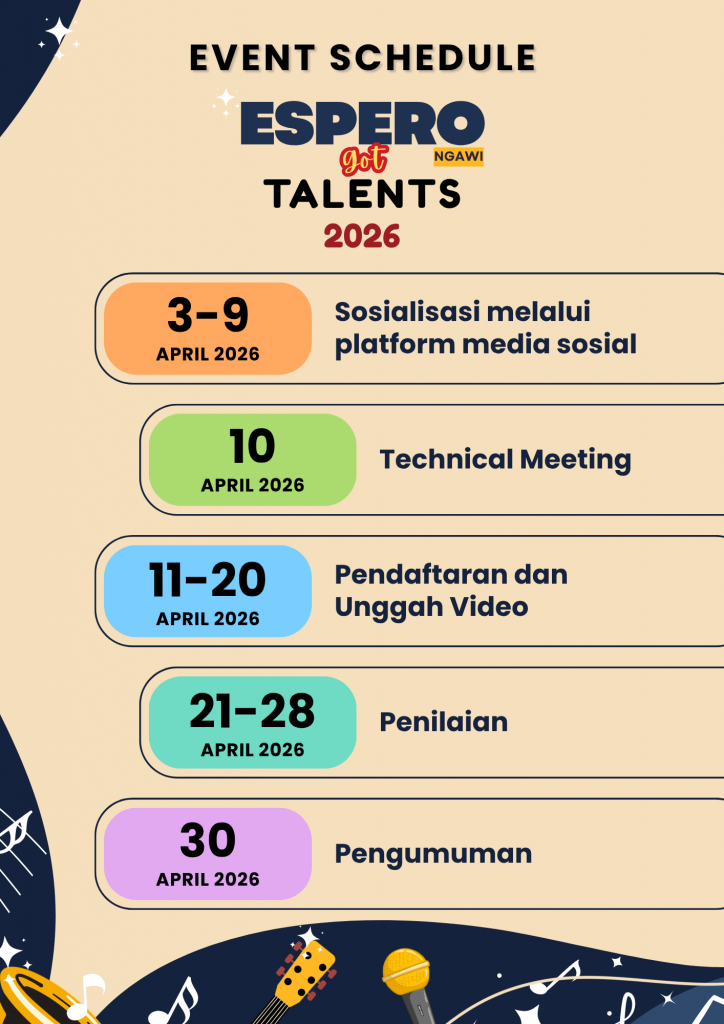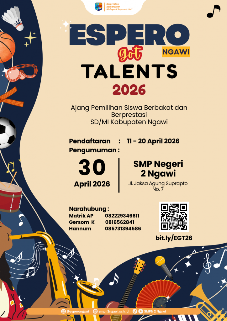 SMP Negeri 2 Ngawi kembali menghadirkan ESPERO GOT TALENTS 2026, ajang bagi siswa SD/MI se-Kabupaten Ngawi untuk menunjukkan bakat, prestasi, dan potensi terbaiknya.