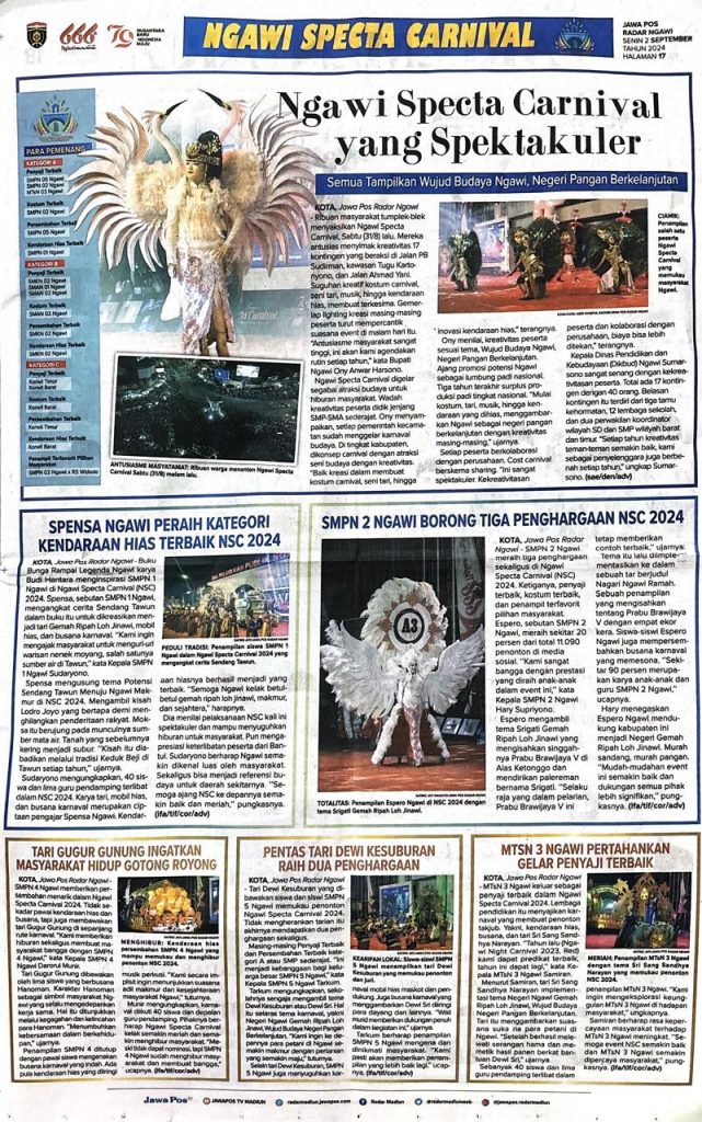 Prestasi gemilang SMP Negeri 2 Ngawi yang menjuarai tiga kategori dalam Ngawi Specta Carnival 2024, mendapat sorotan luas dari media. Salah satu koran terkemuka, Jawa Pos Radar Ngawi menampilkan liputan khusus mengenai penampilan dan keberhasilan di Ngawi Specta Carnival. Dalam artikelnya, Jawa Pos Radar Ngawi memuji kreativitas, semangat, dan kekompakan tim dari SMP Negeri 2 Ngawi yang berhasil menciptakan sebuah pertunjukan yang tidak hanya indah secara visual, tetapi juga sarat makna.